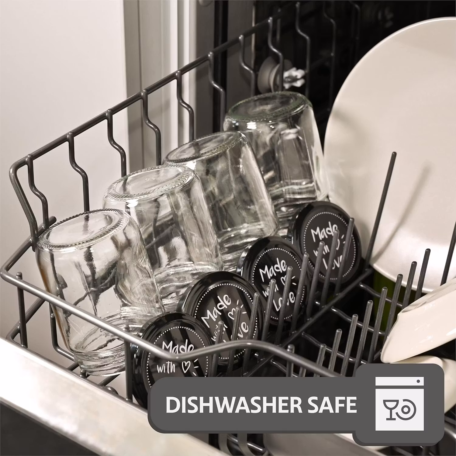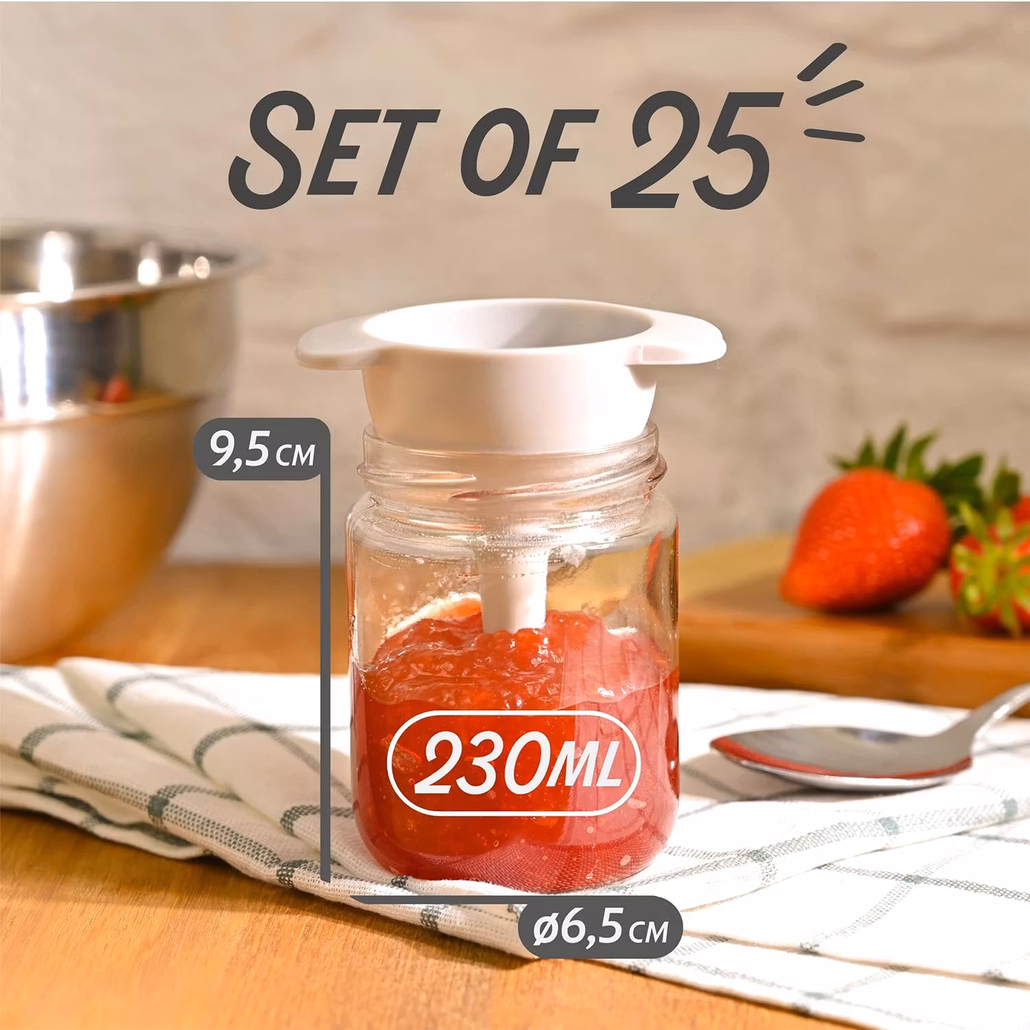 Denna uppsättning innehåller 25 st eleganta glaskannor med en kapacitet på 230 ml, utrustade med lufttäta metallskruvlock i svart. Med svarta etiketter och en vit avtorkbar penna ingår för enkel märkning av innehållet. Burkarna är diskmaskinssäkra och perfekta för att bevara sylt, marmelad, såser, kryddor, eller hemlagade desserter.