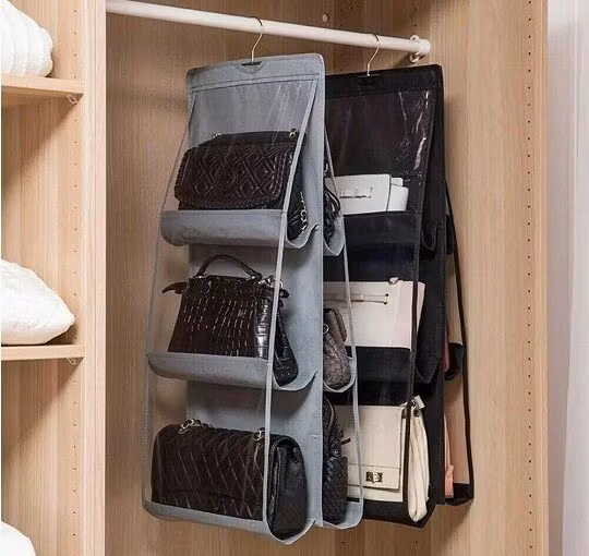 With non-woven fabric and clear PVC materials, your bags could fit either horizontal or vertical and is easily seen. The best part is there's no assembly required! Just hook over the clothes rod, right alongside the clothes hangers. And it doubles as a convenient hanger rod divider!