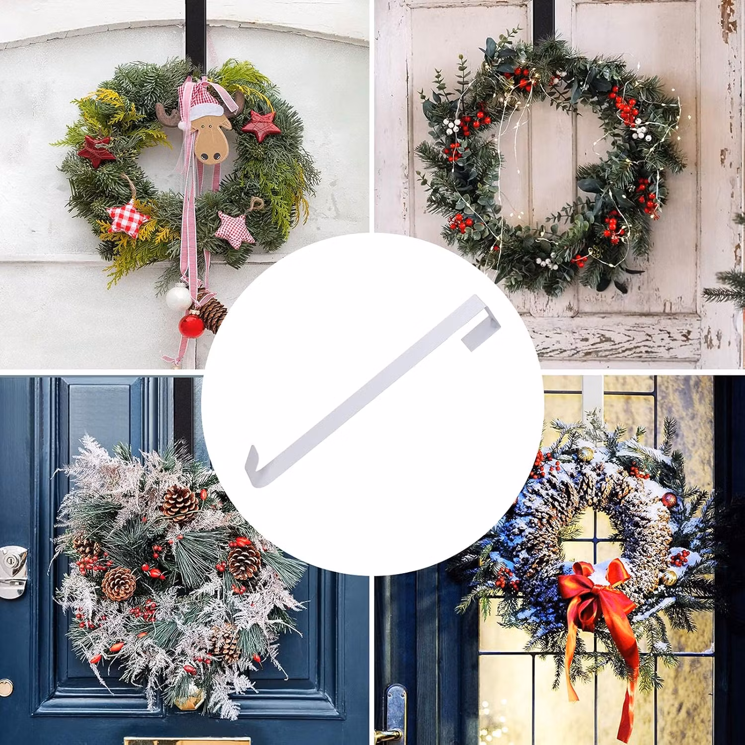 Vit kranskrok i robust metall, designad för att enkelt hängas över ytterdörren och hålla dina kransar säkert på plats.