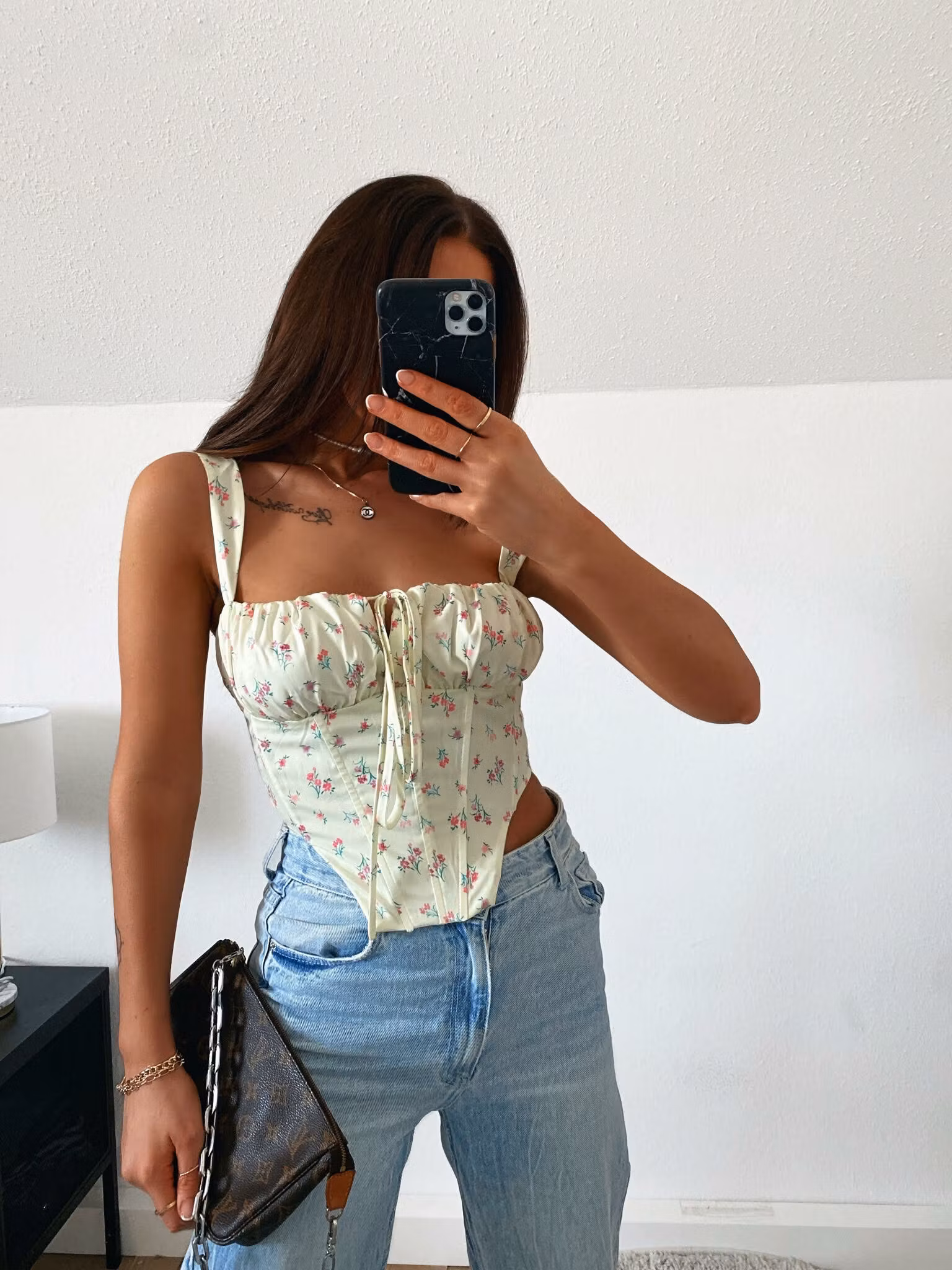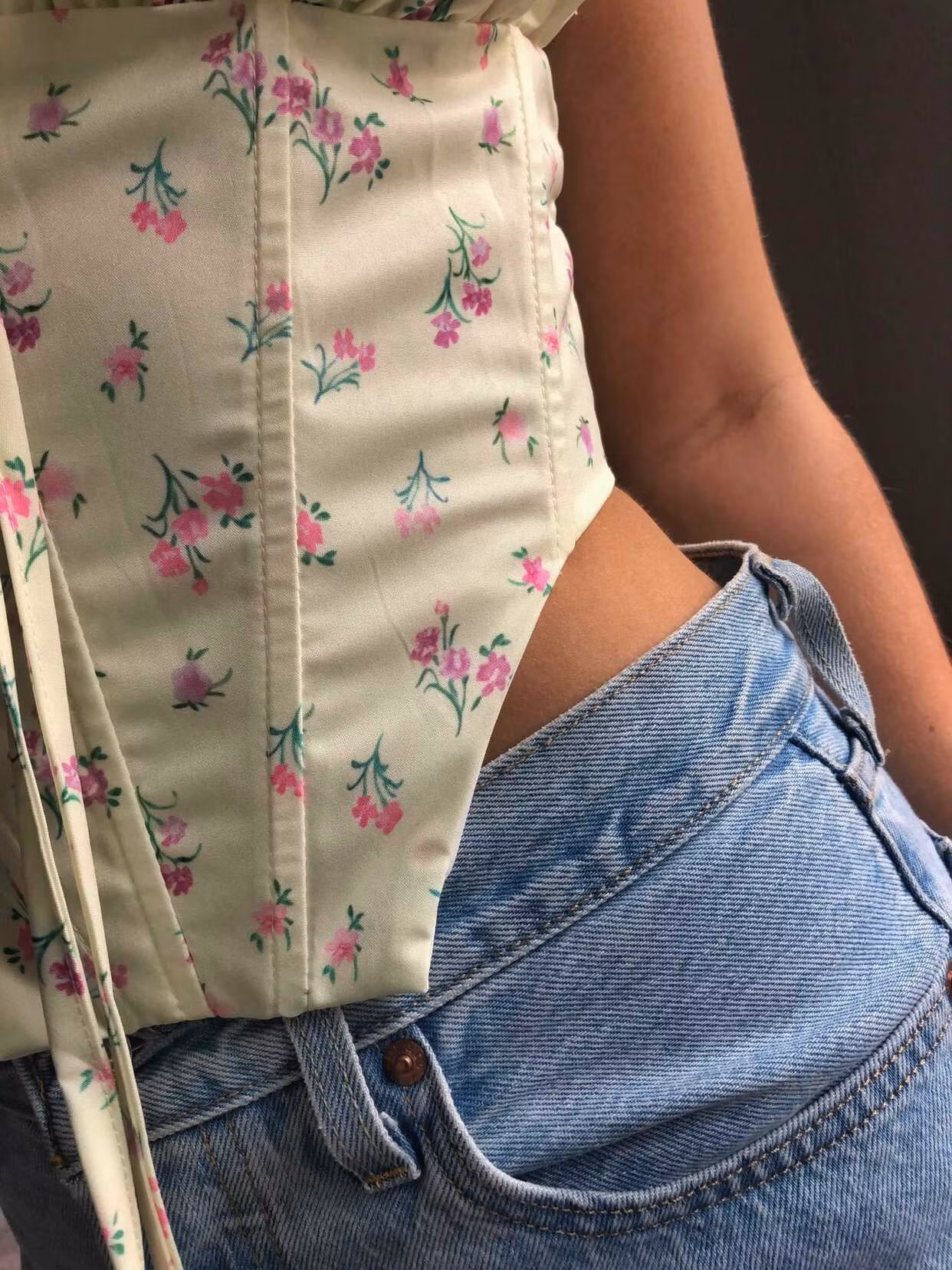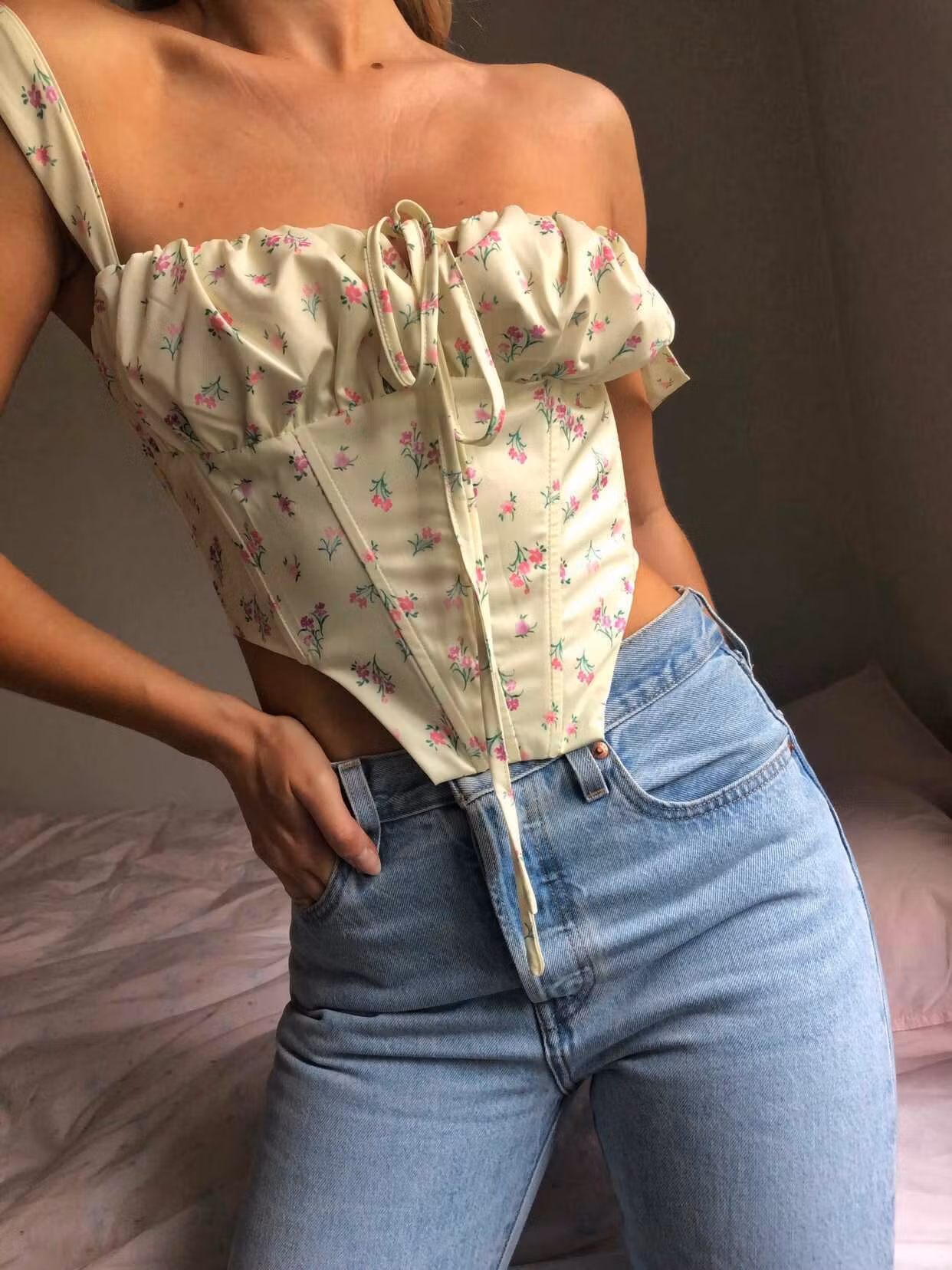 Söt topp med blommigt mönster och snörning i bysten.