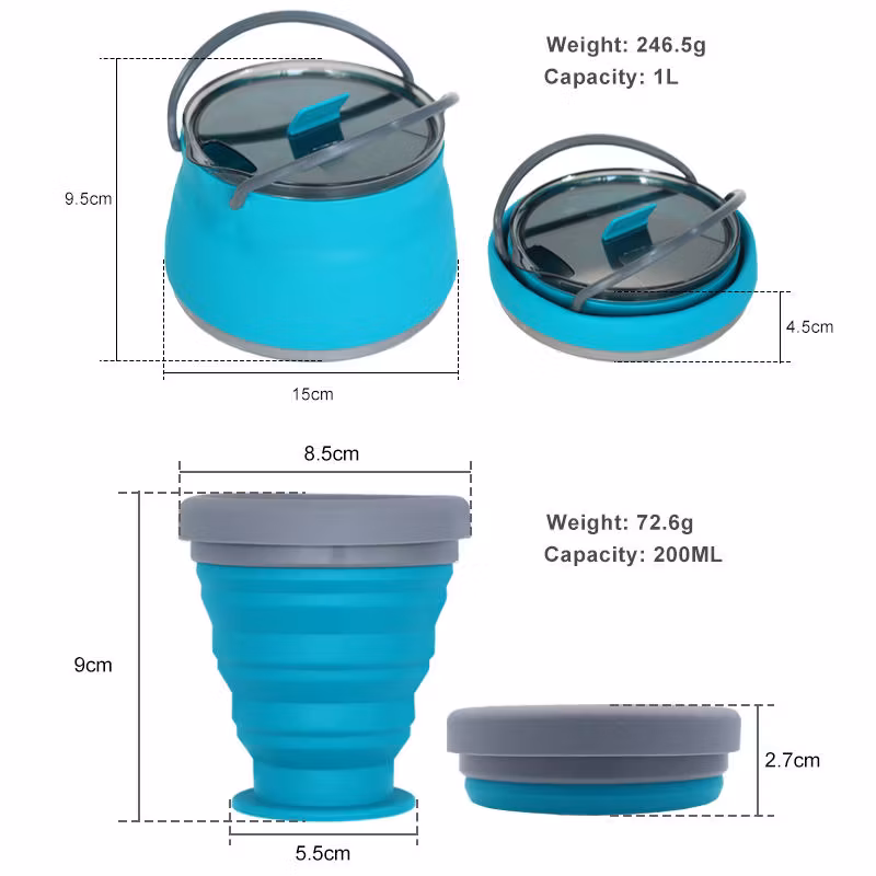Då behöver du inte leta längre än vårt 3-delade silikon-set med hopfällbar kanna, Skål och kopp. Det är den perfekta lösningen för alla dina behov av dryck och kokning utomhus!