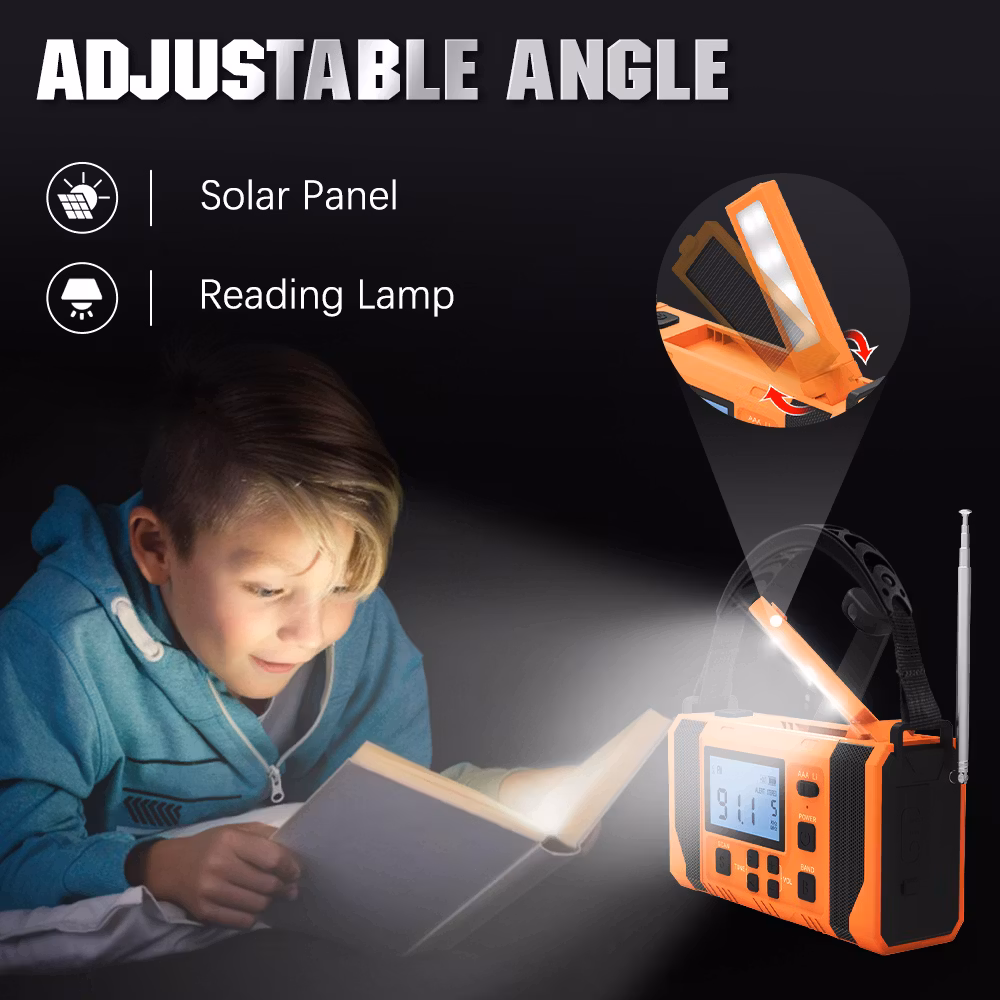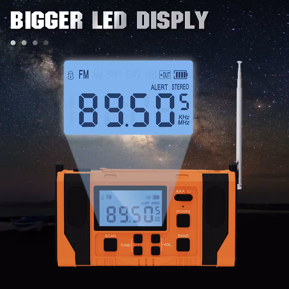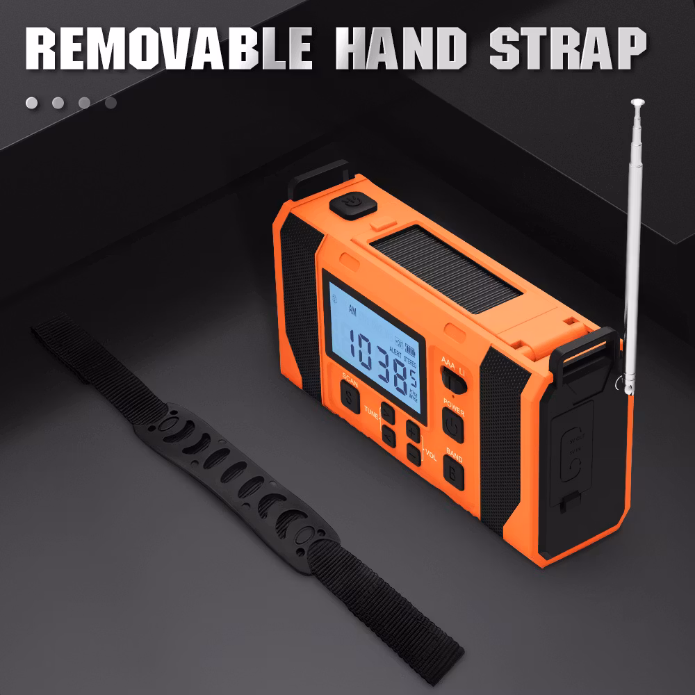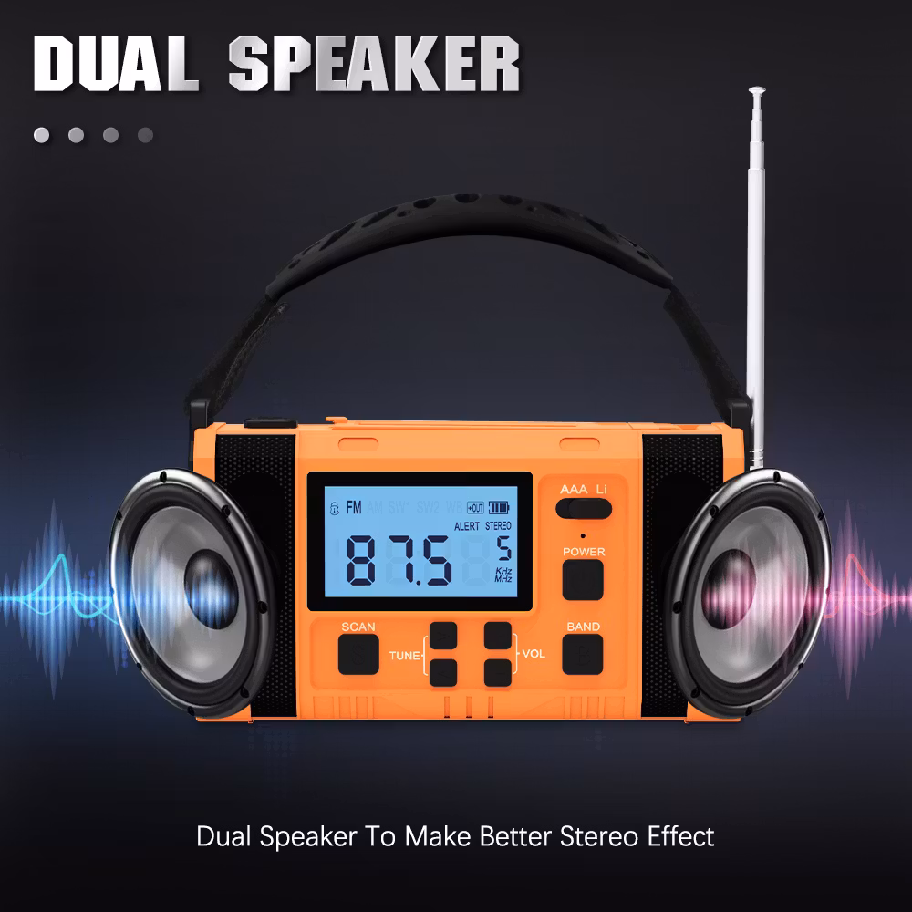 Jämfört med vår mindre vevradio har denna mycket fler funktioner och större styrka. Den kan laddas med hjälp av vev, solceller och i eluttag. Radion har även batteridrift där du kan välja och växla mellan AAA och Lithium batteri. Radion har även en smart "scan"knapp som skannar av och sparar radio stationer. Utöver en ficklampa med 3 olika styrkor så finns även en inbyggd läslampa under solcells-panelen. Denna läslampa har en rotation på 360°.
