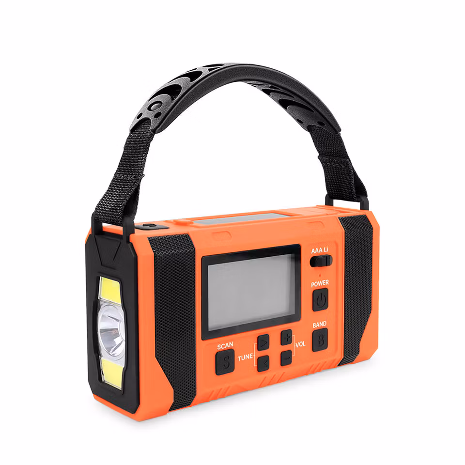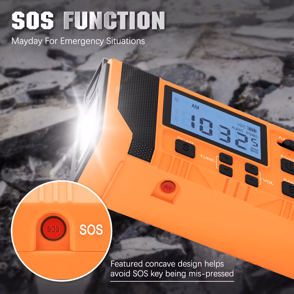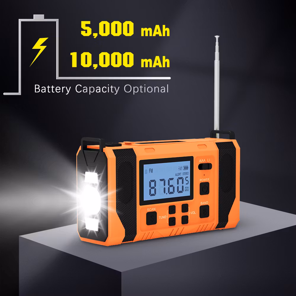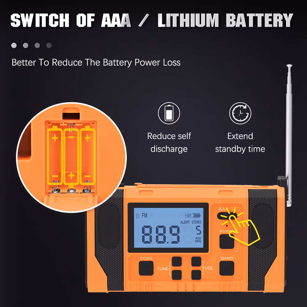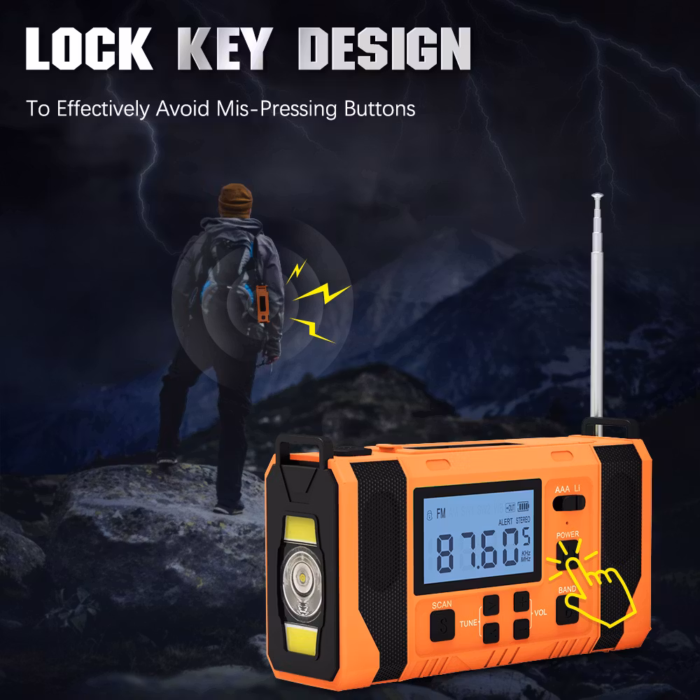 Jämfört med vår mindre vevradio har denna mycket fler funktioner och större styrka. Den kan laddas med hjälp av vev, solceller och i eluttag. Radion har även batteridrift där du kan välja och växla mellan AAA och Lithium batteri. Radion har även en smart "scan"knapp som skannar av och sparar radio stationer. Utöver en ficklampa med 3 olika styrkor så finns även en inbyggd läslampa under solcells-panelen. Denna läslampa har en rotation på 360°.