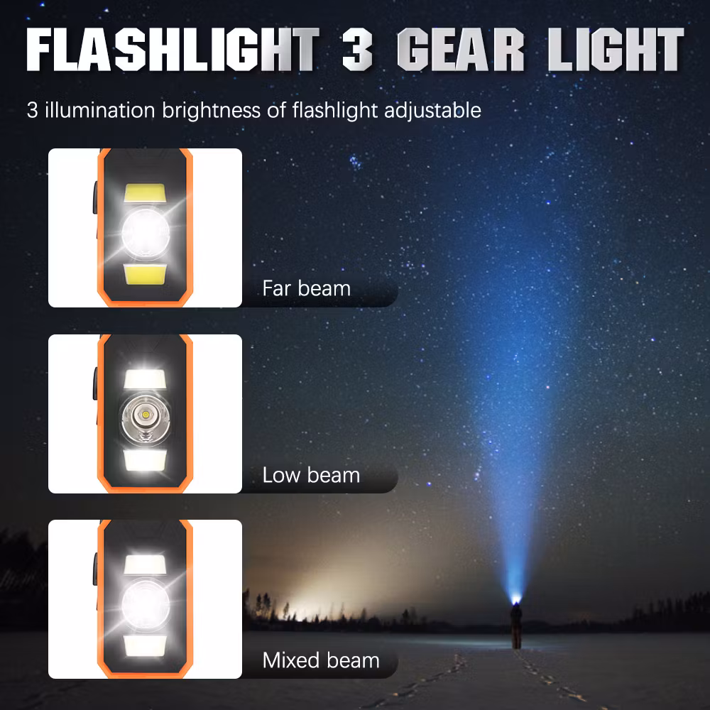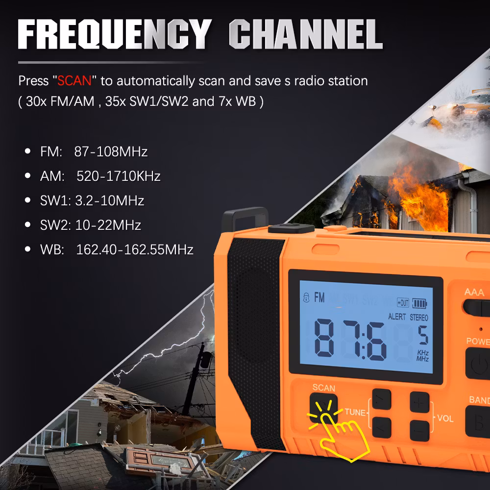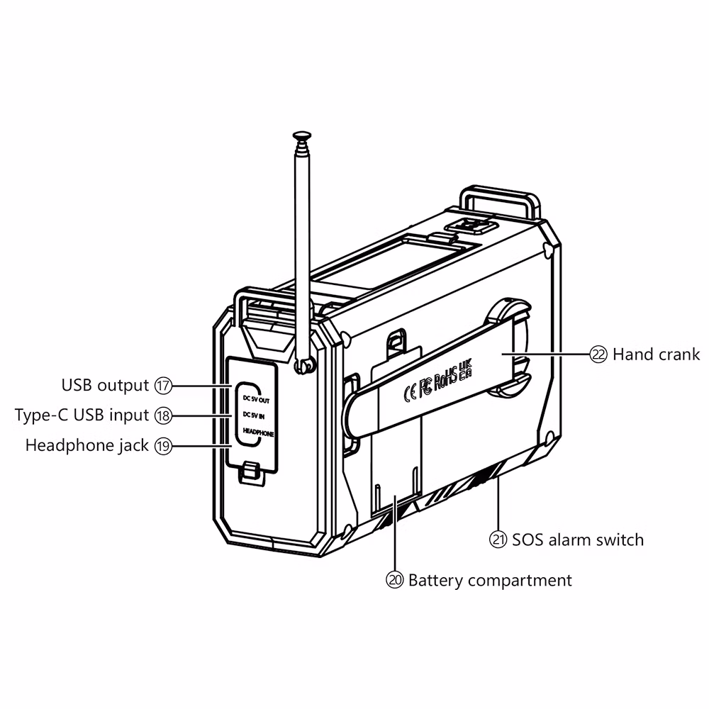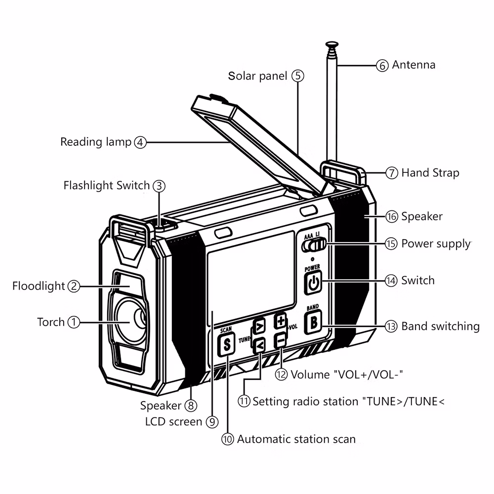 Jämfört med vår mindre vevradio har denna mycket fler funktioner och större styrka. Den kan laddas med hjälp av vev, solceller och i eluttag. Radion har även batteridrift där du kan välja och växla mellan AAA och Lithium batteri. Radion har även en smart "scan"knapp som skannar av och sparar radio stationer. Utöver en ficklampa med 3 olika styrkor så finns även en inbyggd läslampa under solcells-panelen. Denna läslampa har en rotation på 360°.