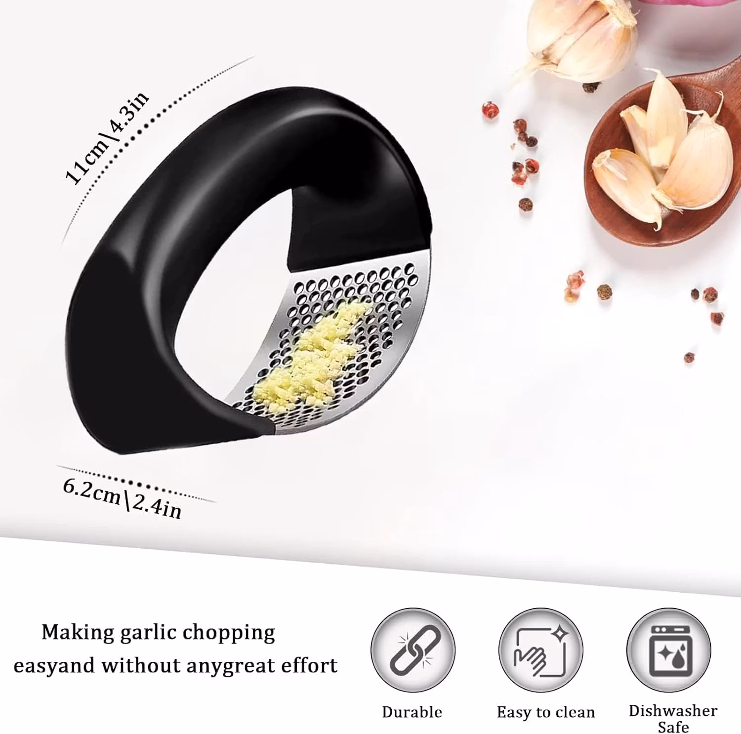 Ge ditt kök ett lyft med vår mångsidiga och praktiska vitlökspress – en perfekt kombination av funktionalitet och stil!