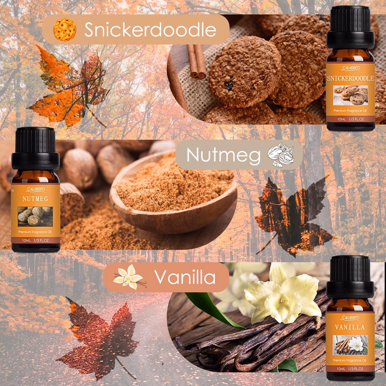 🍁 Salubrito Höst Eteriska Oljor Set – 6 x 10 ml med kanel, pumpakryddad cider, godisdoodle, vanilj och muskotnöt för att fylla ditt hem med höstmys.