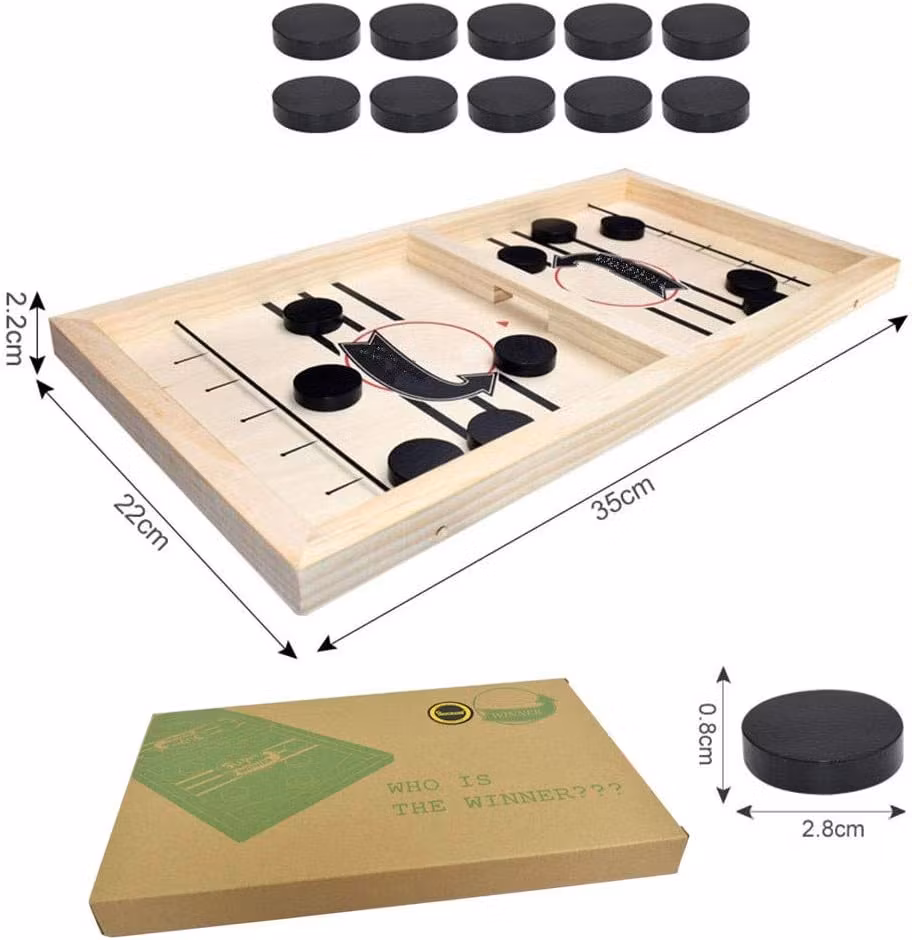 Utmana vänner och familj i detta snabbspel! Placera fem puckar på varje sida av brädet och dra i de elastiska banden för att skjuta puckarna genom mittporten. Den som först rensar sin sida av brädet vinner.