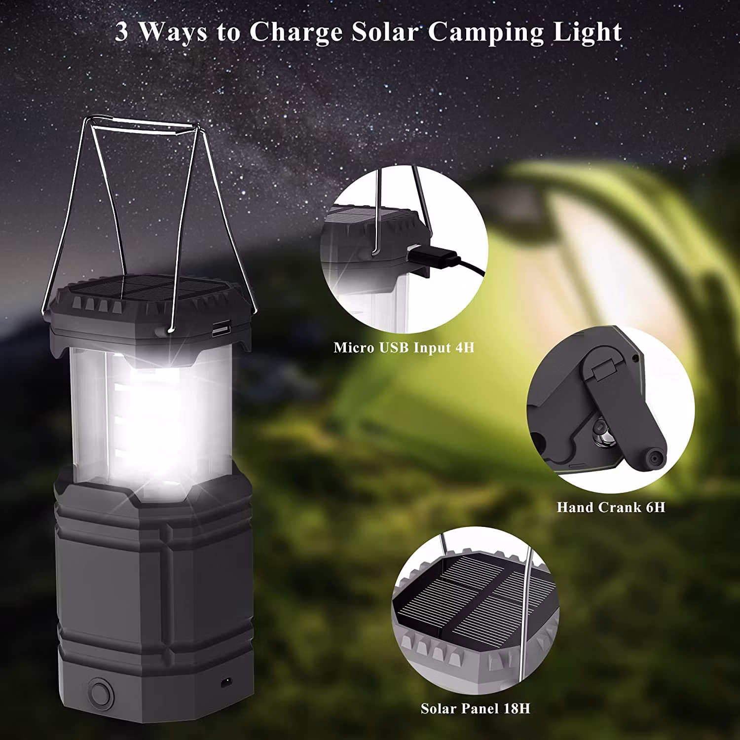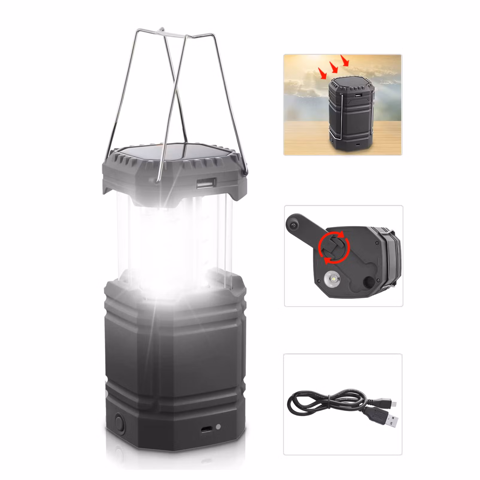 Vår LED-campinglykta har ett inbyggt 3000mAh uppladdningsbart batteri och har 3 strömförsörjningslägen - den medföljande mikro-USB-laddningskabeln eller solpanelen eller vrid på handveven på undersidan för att generera el. Denna lykta har lång brinntid och flera sätt för uppladdning vilket säkerställer att du aldrig behöver oroa dig för att få mörkt vid strömavbrott eller en nödsituation.