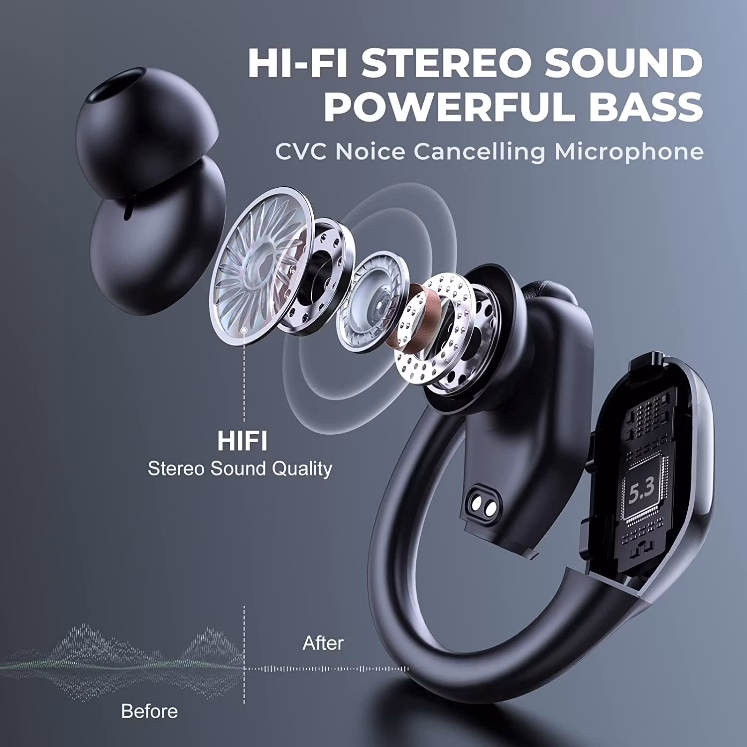IPX7 svettsäker och ergonomisk design: Dessa svettsäkra sporthörlurar använder nano-coating för att professionellt skydda interiören från påverkan av vatten och svett och förlänga livslängden. Den unika öronklädda designen överensstämmer med den ergonomiska designen, vilket gör hörlurarna bekväma. Även vid kraftig träning behöver du inte oroa dig för att headsetet ska glida av.